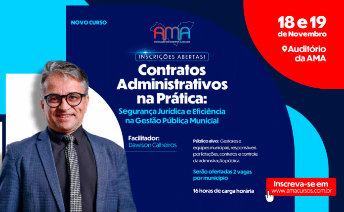 A Associação dos Municípios Alagoanos (AMA) abriu inscrições para o curso “Contratos Administrativos na Prática: Segurança Jurídica e Eficiência na Gestão Pública Municipal”, que será realizado nos dias 18 e 19 de novembro, na sede da instituição, em Maceió.
