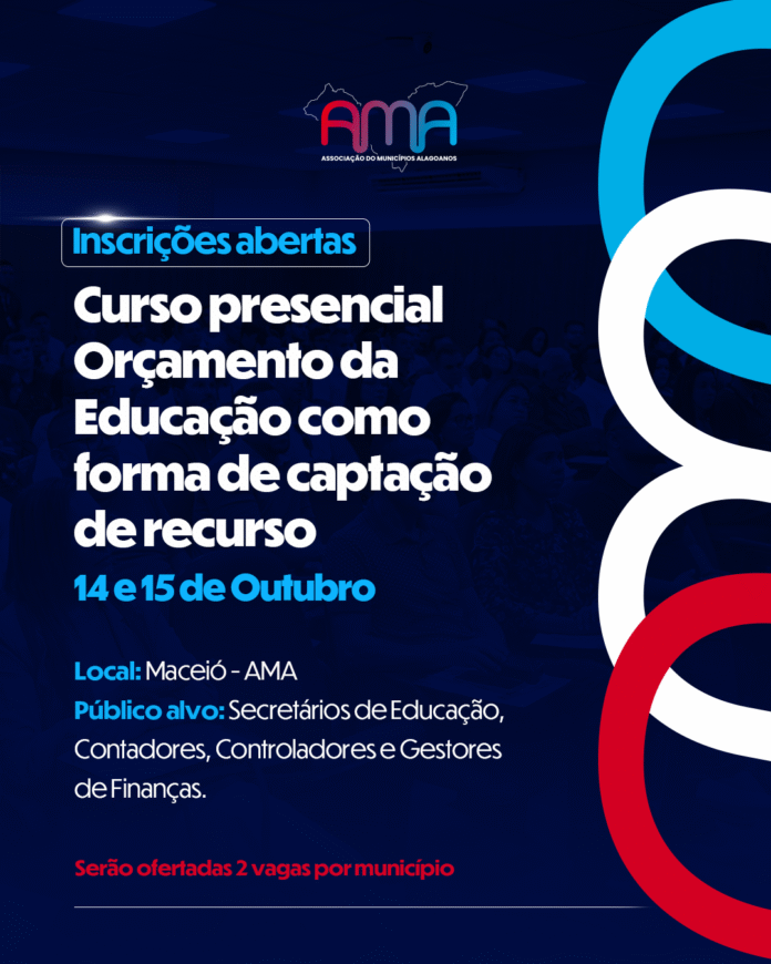 A Associação dos Municípios Alagoanos (AMA) abriu inscrições para o curso “Orçamento da Educação Como Forma de Captação de Recursos: Um Olhar Direto para o CAUC”, que acontece nos dias 14 e 15 de outubro, em formato presencial, na sede da entidade, em Maceió.