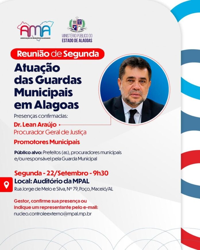 Na próxima segunda-feira (22/09), às 9h30, a Associação dos Municípios Alagoanos (AMA), em parceria com o Ministério Público do Estado de Alagoas (MPAL), realiza reunião com os gestores municipais foco na Atuação das Guardas Municipais em Alagoas. O encontro acontece no auditório do MPAL, em Maceió.