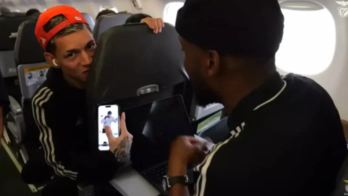 As imagens resgatadas mostram a delegação do Benfica em viagem aos Açores, onde a equipe enfrentou o Santa Clara. No avião, Prestianni aparece sentado à frente de Dodi Lukebakio e exibe no celular a foto de um ladrão usando touca, acessório semelhante ao que o atacante belga vestia naquele momento. Ao mostrar a imagem, o argentino ri. Lukebakio reage tentando afastar o aparelho e pede para não ser filmado.