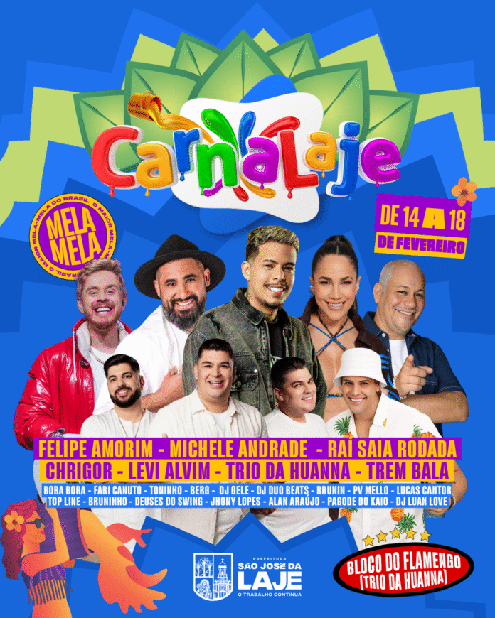 A Prefeitura de São José da Laje divulgou nesta quinta-feira (5) a programação oficial do CarnaLaje 2026. O município é o destino mais procurado em Alagoas durante o carnaval, que é considerado o maior mela-mela do Brasil, a festa será realizada entre os dias 13 e 18 de fevereiro.