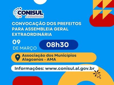 O Consórcio Intermunicipal do Sul do Estado de Alagoas (Conisul) realizará, no próximo dia 9 de março de 2026, uma Assembleia Geral Extraordinária com os prefeitos dos municípios consorciados. O encontro acontecerá às 08h30, na sede da Associação dos Municípios Alagoanos (AMA), em Maceió.