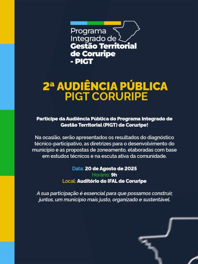 A Prefeitura de Coruripe, por meio do Programa Integrado de Gestão Territorial (PIGT), convida toda a população para participar da 2ª Audiência Pública, marcada para o dia 20 de agosto, às 9h, no auditório do IFAL – Campus Coruripe. O encontro será um momento decisivo na construção coletiva das diretrizes de desenvolvimento do município.
