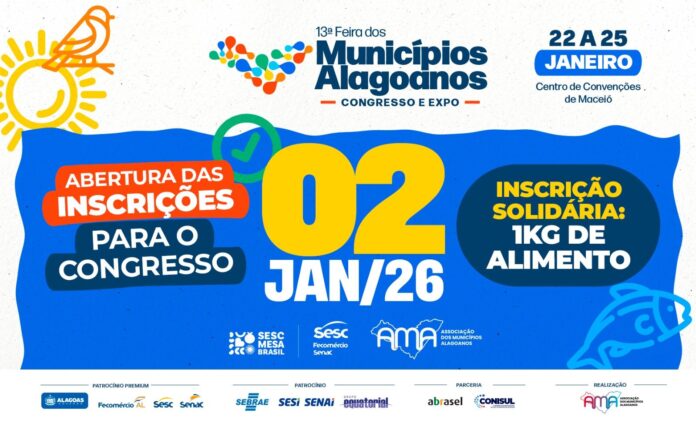 A contagem regressiva já começou para um dos momentos mais aguardados da Feira dos Municípios Alagoanos – Congresso e Expo 2026. A partir do dia 02 de janeiro, estarão abertas as inscrições para as palestras do Congresso dos Municípios, que acontece de 22 a 25 de janeiro, no Centro de Convenções de Maceió.