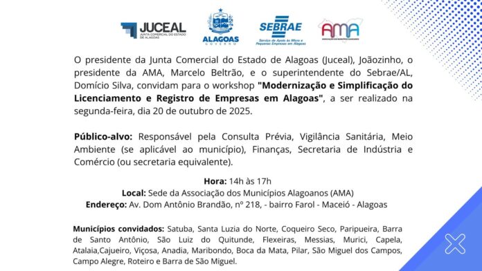 O workshop para os 21 municípios da região Metropolitana será das 14h às 17h, será dada continuidade ao workshop denominado como “Modernização e Simplificação do Licenciamento e Registro de Empresas em Alagoas”, com foco nos servidores municipais. Entre os temas, serão abordadas as análises das consultas prévias de localização e os ambientes de licenciamento empresarial ligados à Vigilância Sanitária e às secretarias de Meio Ambiente, Finanças, Indústria e Comércio.
