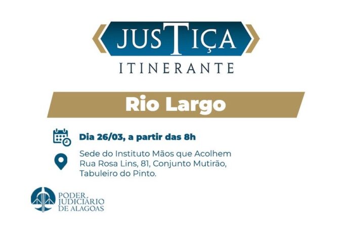 O Tribunal de Justiça de Alagoas (TJAL), por meio do programa Justiça Itinerante, leva serviços gratuitos aos moradores do município de Rio Largo nesta quinta (26). A ação terá início às 8h, na sede do Instituto Mãos que Acolhem, situada à Rua Rosa Lins, 81, Conjunto Mutirão, Tabuleiro do Pinto.