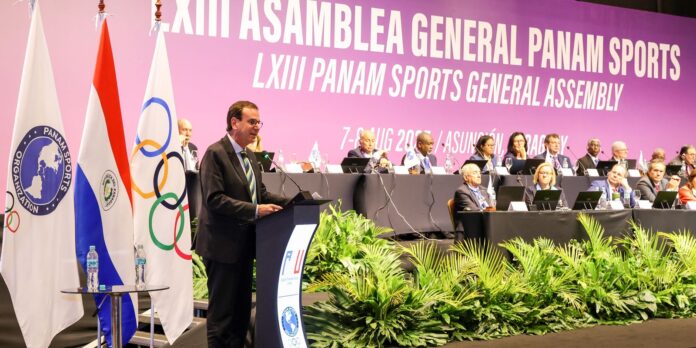 Assunção, 08/08/2025 - Jogos Pan-Americanos Júnior Assunção 2025 - Assembléia PANAM. O presidente do COB Marco La Porta apresenta candidatura das cidades do Rio de Janeiro e Niteroi para sedes dos Jogos PanAmericanos e ParaPan de 2031. Foto: Miriam Jeske/COB