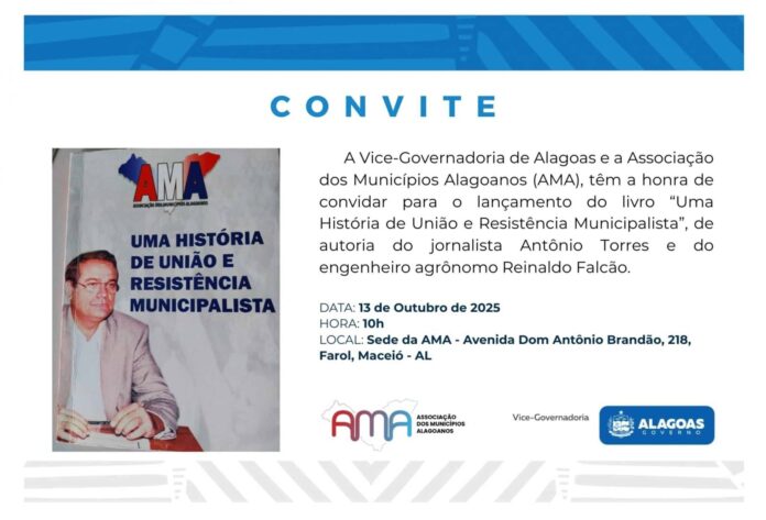 O livro será lançado no próximo dia 13 de outubro, às 10h, na sede da Associação dos Municípios Alagoas (AMA), em Maceió, de autoria do engenheiro agrônomo, gestor público e ex-secretário executivo da AMA Reinaldo Falcão e de Antônio Bezerra Torres, advogado, jornalista e também ex-secretário executivo da entidade.